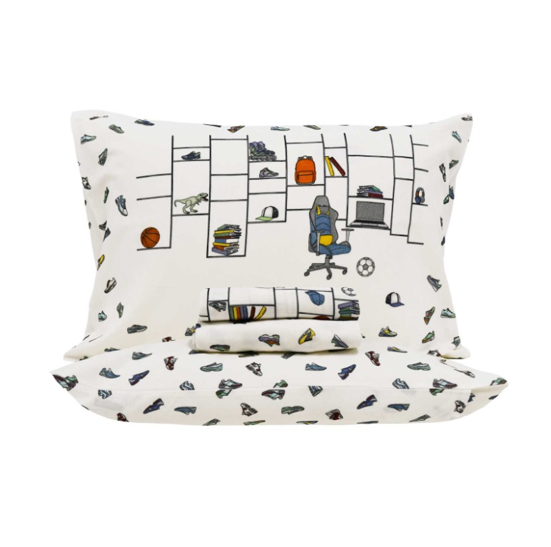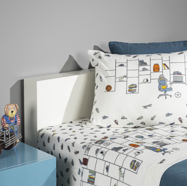 O jogo de lençóis School é produzido em flanela laminada 100% algodão, que lhe confere um toque aveludado e extra suave, com um ótimo isolamento térmico e resistente à formação de borboto.