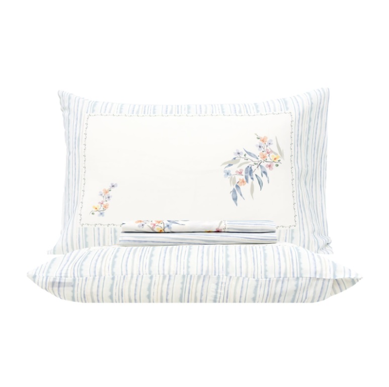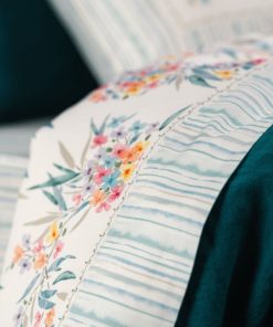 Disponível nas cores rosa e azul, este jogo de lençóis apresenta flores tropicais de diversas cores juntamente com listas, dentro das tonalidades azuis e verdes, em degradê. Deixe que os sonhos o transportem para uma ilha tropical onde o aroma das flores lhe trará a harmonia e o relaxamento necessários para uma noite agradável.